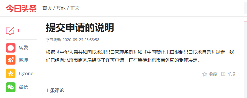 字节跳动发布提交申请的说明:根据《中华人民共和国技术进出口管理条例》和《中国禁止出口限制出口技术目录》规定,我们已经向北京市商务局提交了许可申请,正在等待北京市商务局的受理决定。