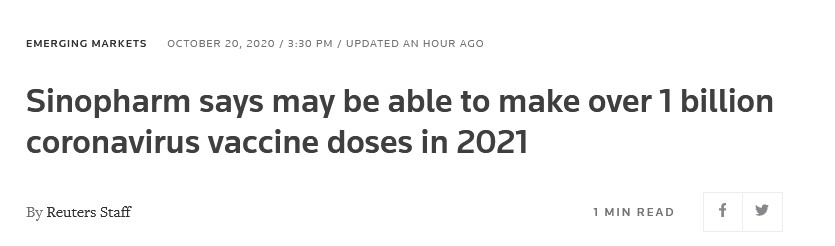 国药集团或将于2021年生产超过10亿剂新冠疫苗