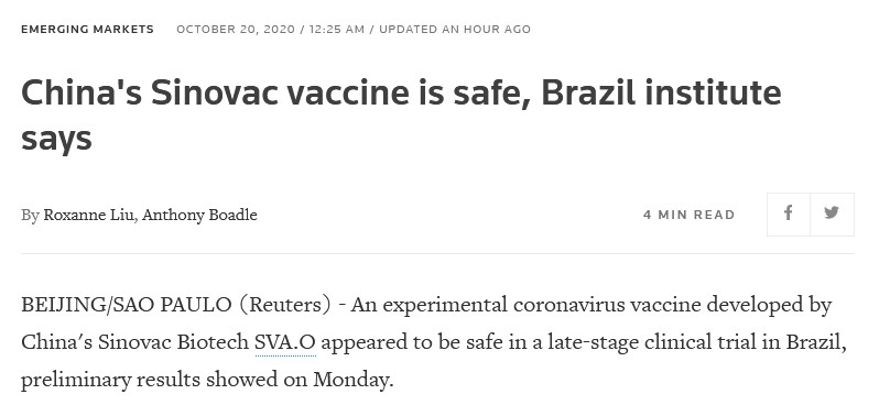 在美股上市的中国疫苗公司科兴生物在巴西进行了大量的后期临床试验,目前已进入第三期。这项疫苗试验是在巴西领先的生物医学研究中心之一圣保罗Butantan研究所进行的,疫苗称为CoronaVac。