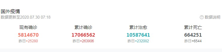 Worldometer网站实时统计数据显示,截至北京时间7月27日6时30分左右,全球累计确诊新冠肺炎病例16380401例,累计死亡病例651198例,79个国家确诊病例超过万例。