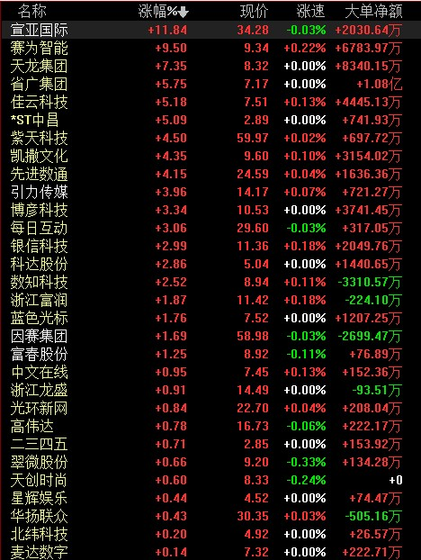午间传出抖音业务单独上市港股后,今日头条概念个股宣亚国际上冲,但随后回落。