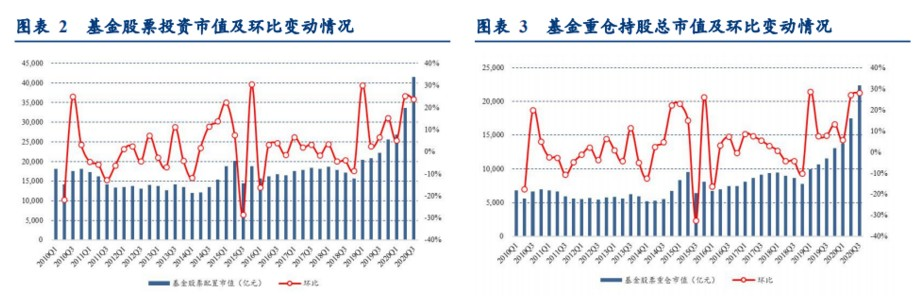 根据基金2020年三季报披露数据,截止2020年9月30日,基金股票投资市值合计41567.69亿元,环比大幅增长23.7%;基金重仓持股总市值22357.46亿元,环比增长28.05%。公募持股占比继续提升,基金的仓位创下历史新高。