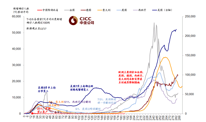 短期市场仍在疫情、疫苗和政策三者拉锯影响;整体方向积极。短期来看,美国疫情仍在升级、新增确诊逼近25万,虽然部分州有所改善,但对医疗资源的挤兑仍未有效缓解,住院、ICU和死亡人数继续增多;欧洲也略有抬头迹象。疫情升级的短期负面影响不可避免。
