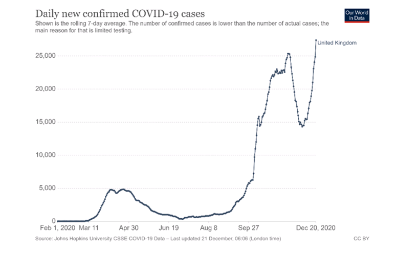由于英国出现新冠病毒的新变种,导致过去几周疫情再度恶化,新增确诊病例再度回升并超过11月初上一轮封锁前高点。根据英国媒体的报道,英国卫生官员表示这一新的变异可能导致病毒具有更高的传染性,比当前高出70%(当前英国的传播系数R为1.1~1.2之间)。