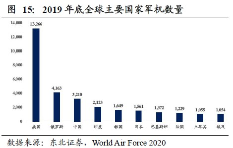 东北证券研究发现,截至2019年底,美国拥有军用飞机13266架,数量居全球第一;其次是俄罗斯,数量达4163架;我国拥有军机数量为3210架,在总量上我国军机仅为美国总数的24%,总量与美国存在局大差距!