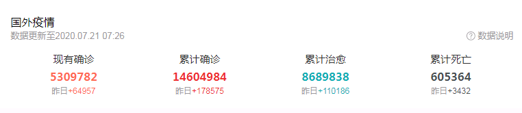 美国约翰斯.霍普金斯大学发布的统计数据显示,截至北京时间7月20日22时35分,全球新冠肺炎确诊病例上升至14,538,115例,其中死亡病例达到606,922例。