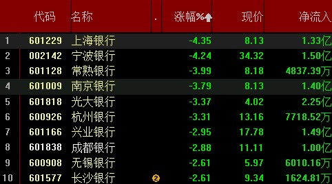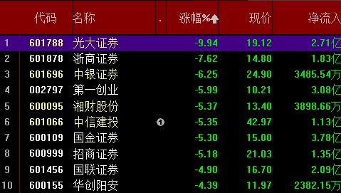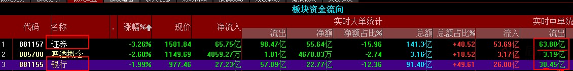 今日金融板块重挫,证券板块跌幅超3.2%,光大证券跌停,浙商证券、中银证券等个股跌幅超6%。银行整个板块跌幅近2%,上海银行、宁波银行、常熟银行跌幅均超4%。两个板块资金净流出达94亿。