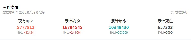 Worldometer网站实时统计数据显示,截至北京时间7月27日6时30分左右,全球累计确诊新冠肺炎病例16380401例,累计死亡病例651198例,79个国家确诊病例超过万例。