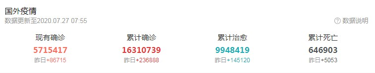 Worldometer网站实时统计数据显示,截至北京时间7月27日6时30分左右,全球累计确诊新冠肺炎病例16380401例,累计死亡病例651198例,79个国家确诊病例超过万例。