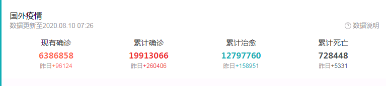 霍普金斯大学9日发布的新冠疫情最新统计数据显示,美国累计确诊病例已超过500万例。目前全球确诊病例接近2000万例。