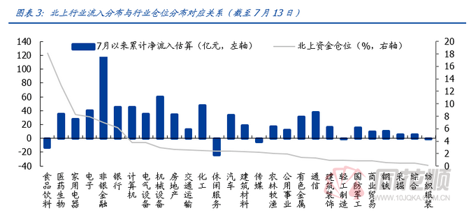 在行业结构上,7月巨幅外资流入更多集中在非传统重仓板块。北上持仓结构数据显示,食饮、医药、家电、电子、银行和非银金融这6大行业占北上总持仓的60%左右,为外资最喜爱的板块。