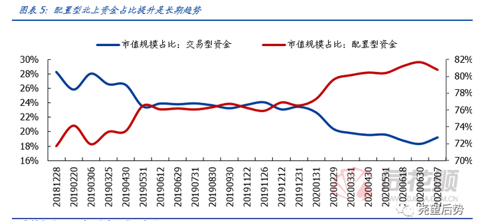 从历史变动看,配置型资金的规模占比在19年上半年和今年上半年都经历了明显的趋势上行。长期来看,配置型资金不仅是北上资金的主体,而且资金占比正在趋势提升。