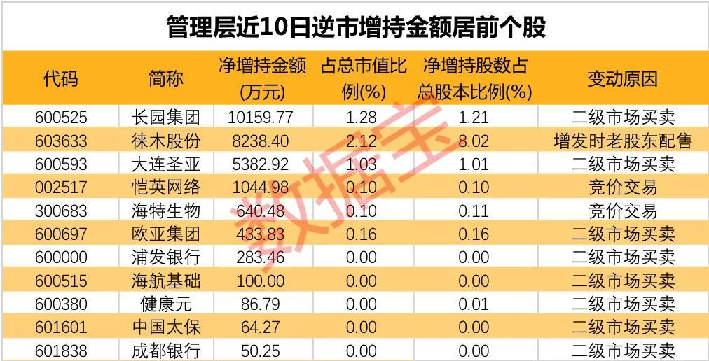 统计,在7月14以来的大盘调整期间,11家A股公司获得了高管50万元以上的逆市净增持。除徕木股份的股东增持来自增发股份的老股东配售外,其余公司的增持均通过二级市场买卖或竞价交易完成。