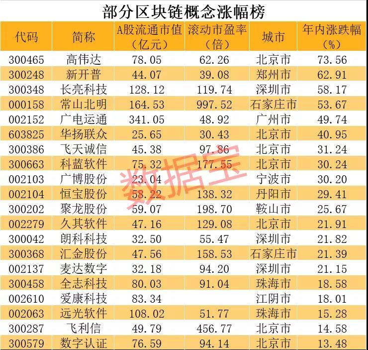 筛选出与区块链概念相关性较高的龙头标的,合计有40多只个股。其中,高伟达、新开普、长亮科技等个股年内涨幅均超过50%,广电运通、华扬联众、飞天诚信等个股涨幅超过30%。